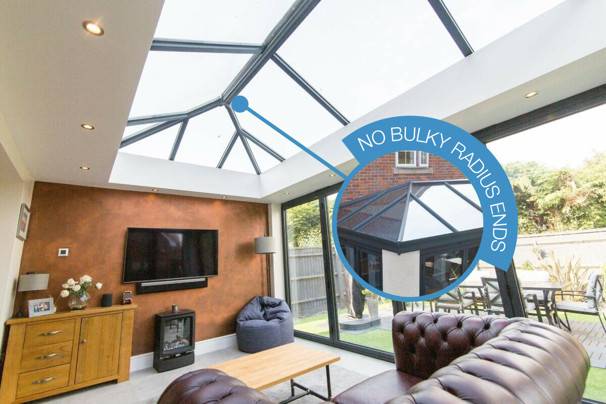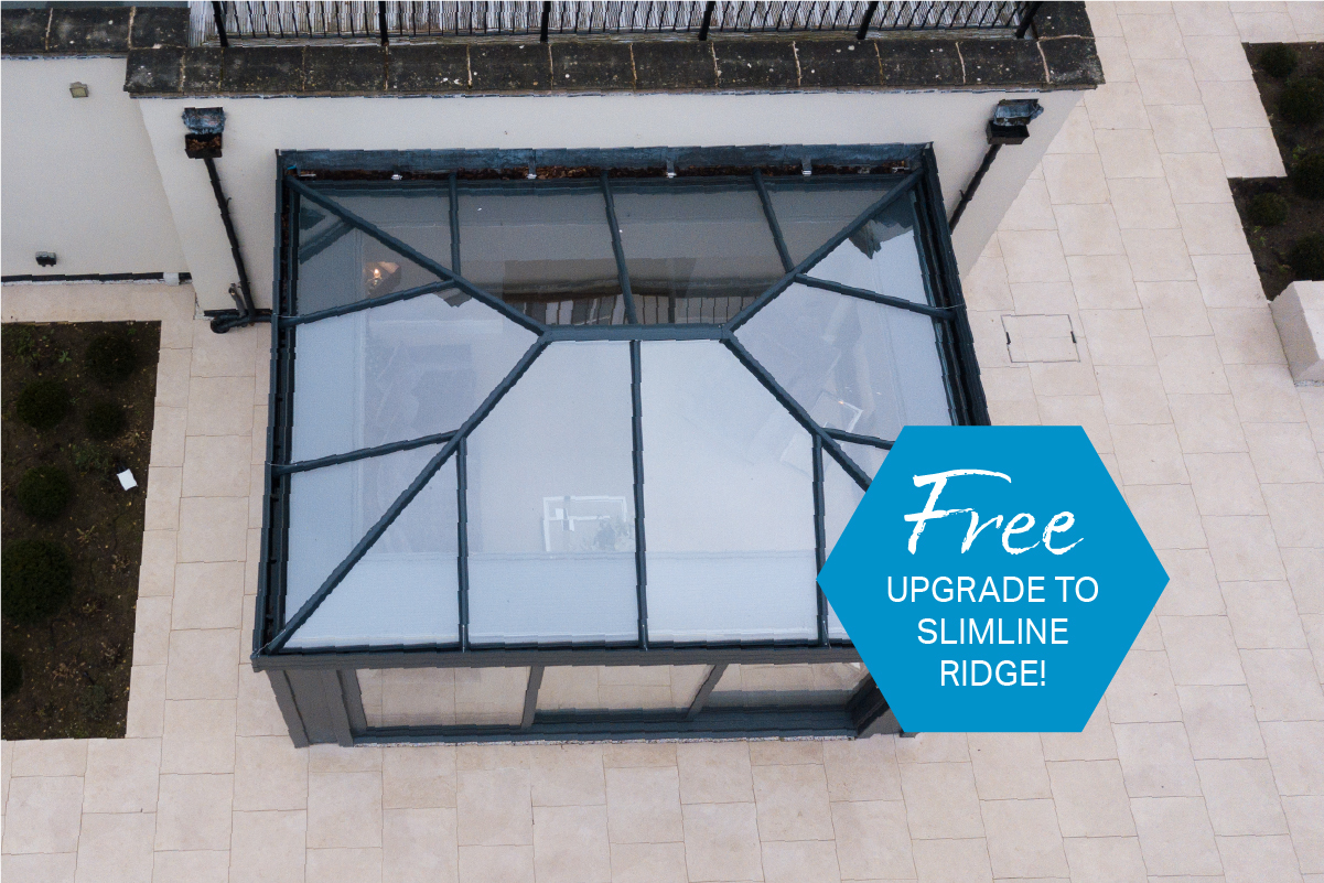 You can now upgrade to the contemporary, modern slimline ridge on your glass roof designs for free. The slimline ridge has a minimalist, modern look thanks to a neat lantern-style ridge end design with no bulky radius ends.